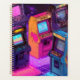 Um grupo de máquinas de fliperama vintage fica iluminado por luzes de néon vibrantes. A cena é colocada contra um pano de fundo de uma galáxia estrelada, criando uma atmosfera nostálgica, mas futurista.