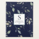 Mantenha-se no topo dos seus compromissos e tarefas com este planejador sofisticado. Este design apresenta um padrão frouxo de folhas verdes de aquarelas sobre um fundo azul marinho, sobrepostas com um retângulo branco, bordado com mudo, com o seu inital/monograma, nome e ano em cinzas e marinhos. O reverso do planejador também apresenta o padrão das folhas em um fundo azul marinho.