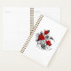 Contour, mechanical crescent moon with gears, decorated with red roses with black spiked stems and leaves on white background. Steampunk