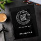 Logotipo elegante de medalhão branco e preto. É simples, elegante e eterno. Atualize com as informações, a linha de etiqueta ou o slogan e o site da sua empresa, deixando-o vazio, se necessário. Este planejador traria um belo e prático presente para seus parceiros de negócios, funcionários, fornecedores muito importantes como clientes.