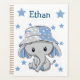 Design de um bebê elefante bonito. Adorável elefante bebê sentado feliz, com seu pequeno chapéu e estrelas. Personalize de acordo com o seu gosto.