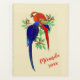 Papagaios sorridentes bonitos sentados num galho florescente com folhas verdes. Cores escuras, azul elétrico, vermelho, laranja, verde, turquesa, bege. Nome personalizado, fonte manuscrita de tendência, vermelho. Colorida, fofa, fresca, divertida. Um presente personalizado de excelente para quem ama pássaros. Trabalho de arte é baseado em um impressão japonês antigo.