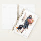 Uma mulher na moda, chica, carregando um buquê de flores com seu cachorro. Este planejador pode ser personalizado com um nome no canto inferior direito e uma data no canto superior direito. O fundo está numa sombra neutra.