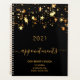 Um fundo preto elegante, decorado com estrelas douradas sujas. Personalize e adicione um título, nome comercial, informações de contato na frente. O título do livro é escrito com um grande e moderno script de estilo escrito à mão no ouro. Para manter as hastes, exclua apenas o nome da amostra, deixe os espaços ou emoji na frente e depois do nome. Um planejador de compromisso para 20xx para maquiadores, designers de cabelo, cabelos e salões de beleza.