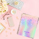 Um fundo holográfico de tendência, colorido, com cores pastel unicórnio e arco-íris, cor rosa e púrpura, verde. Decorado com pingos falsos em rosa e roxo. Personalize e adicione um nome, escrito com um script de estilo manuscrito, entre elas, moderno. Adicione um ano. Letras cor púrpura.