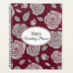 Este caderno de plantas é mostrado com um impressão floral rosa num fundo Bordéus rico. Nome personalizado para personalizar para o seu oval dentro a branco com duas bordas coloridas coordenadas de massa e ameixa na frente. Passe a mesma cor e rosa floral impressão. O texto é mostrado em Preto. Cores de Cinzas, Pastel Mauve, Bordeaux. Personalize este item ou comprar como está.