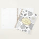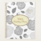 Este notebook planejador é mostrado com um rosa floral colorido de cinza prateada e um impressão de corações dourados em um fundo branco. Nome personalizado para personalizar para o seu oval de marfim dentro com duas bordas coloridas coordenadas de ouro e cinza prateada na frente. Passe a mesma cor e rosa floral impressão. O texto está no ouro. Selecione a espiral do seu aglutinante de lado, esta é mostrada com ouro. Personalize este item ou comprar como está.