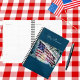 Esta imagem de bandeira americana, é destacada contra, fogos de artifício que explodem, numa exibição colorida de, vermelho, branco, azul e amarelo, flares em um céu nublado e crepúsculo, de azul ardente.