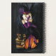 Uma bruxa loira sentada numa abóbora laranja grande. Ao seu lado está uma gata de bola sentada sobre uma pilha de livros. Por trás está uma floresta e um castelo.