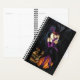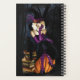 Feiticeira loira sentada numa abóbora laranja grande. Do seu lado está uma gata negra numa pilha de livros. Por trás está uma floresta e um castelo.