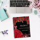 Um fundo na moda preto decorado com flores vermelhas, faíscas e um vestido vermelho. Personalizar e adicionar nome, idade e data.