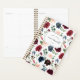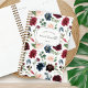 O planejador personalizado floral gráfico apresenta um padrão de fundo de flores de aquarela em rico burgundy marsala, rosa-pincel e azul-marinho, com folhagem verde-luxuosa e folhas de eucalipto. Personalize com três linhas de texto personalizado.