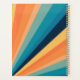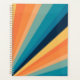 Ilustração geométrica de raios solares de estilo retrô com listras amarelas, laranja, azuis e turquesas