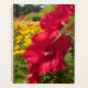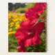 Um pequeno grupo de lindas flores vermelhas de hibisco num jardim ensolarado.