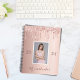 Um fundo metálico rosa dourado falso com aspecto elegante, pingos rosa dourados, pintura pingada. Modelos para sua própria foto, ano e título. O título é escrito em ouro rosa escuro com um grande estilo escrito à mão moderno. Perfeito para a escola, o trabalho ou a organização da sua vida pessoal/familiar