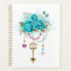Chave de ouro antiga com rosas de turquesa de tendência, decoradas com folhas de ouro branco e miçangas cor-de-rosa e azuis. Cor agradável. Rosas de turquesa. Ouro branco. Tifania azul.