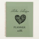 Planner de Coração de Padrões de Leopardo Verde e Negro Elegante, legal, glamouroso e feminino com um coração verde-sábio e um padrão-leopardo negro. Personalize e adicione seu nome. Modelo por um ano, letras negras. O nome é escrito com um moderno estilo escrito à mão. Perfeito para empresárias, maquiadoras, donas de lojas, consultores.