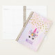 Planejador personalizado projetado com um unicórnio rosa de tendência. Adorado com um fone floral de rico. Borboletas brancas voando por aí. Confete de ouro falso esboroado ao longo do topo. Um fundo de cor d'água pálido e amarelo.