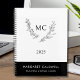 Planeador Anual do Monograma Branco e Negro... A frente do nosso planejador preto e branco clássico mostra um logotipo de negócio de uma coroa botânica elegante, junto às suas duas iniciais de monograma, a tinta preta, tudo num fundo branco. Seu nome e título (ou nome da empresa) aparecem em tinta branca em um retângulo preto próximo ao fundo do planejador, dando uma estrutura autoritativa para equilibrar a delicada coroa de folhas. Todo texto pode ser facilmente revisado no modelo de personalização.