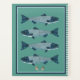 Quatro trutas ou salmões simples, de tons azuis, no estilo de arte folk, sobre um fundo azul-esverdeado claro. Para obter mais contraste, você pode alterar a cor de fundo. Há dois locais onde você pode personalizar adicionando seu próprio texto. Você pode alterar a fonte e a cor do texto. Você também pode mudar as cores da borda ou removê-la completamente.