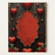 Um toque de gótica, corações e conexão eterna. O design apresenta um design de fundo escuro e elegante que imediatamente desenhar atenção. Vários corações vermelhos brilhantes, alguns aparentemente se transformaram em colírios, penduram em cordas delicadas e finas, emprestando ao cartão um toque lúdico e romântico. O centro é dominado por um quadro articamente desenhado com um interior vermelho, decorado com um delicado padrão de rosa simbolizando amor e paixão. No fundo, buquês exuberantes de rosas vermelhas com verde esmagador adoram a carta, sublinhando a atmosfera romântica.