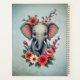 Um toque de verão: O bebê elefante num mar de flores . Essa design encantadora apresenta uma ilustração amorosa de um pequeno elefante bebê, pintado em delicadas sombras de cinza. Suas orelhas cor-de-rosa acrescentam um toque divertido e encantador. Seus olhos grandes e expressivos irradiam curiosidade e amizade, enquanto sua doce expressão facial transmite puro calor. O elefante se encaixa gentilmente entre uma variedade de flores coloridas em tons vibrantes de vermelho, laranja, rosa e branco.