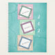 Um fundo de cor azul ou lacrimejante com quadros coloridos para as suas próprias fotos. Use as modelos para personalizar este planejador e adicionar três fotos que você gostaria de ver no cobrir deste planejador. O ano também é um texto modelo, então certifique-se de mudar o asterisco para o ano para o qual você o compra.
