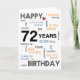 Que seu dia especial seja cheio de alegria, risos e momentos inesquecíveis que você pode apreciar por anos. Desejando-lhe toda a felicidade do mundo no seu aniversário e sempre! Descrição: o Vamos comemora o incrível marco de 72 anos com a nossa maravilhosa carta de 72 de aniversário! Seja para a sua querida mãe, pai amada, querido irmão, ou irmã amada, esta carta oferece uma bela avenida para expressar os seus desejos sinceros e chá-os de alegria e amor no seu dia especial. A frente do cartão mostra orgulhosamente "Parabéns" ao lado do número significativo 72, representado em décadas, anos, meses, semanas, dias, horas, minutos e segundos, destacando o significado desta ocasião importantíssima.