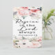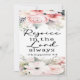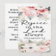 Um belo cartão floral com Philippians "Rejoice in the Lord Always" 4:4 "Que seja um lembrete gentil: Não importa a estação, o Senhor está perto. Mesmo em julgamentos, há alegria em Sua presença. Deixe seu coração ser erguido, seu espírito refrescado, e sua alma ancorada na alegria que só Ele dá. Respire fundo. Sorria. Deus ainda é bom. E essa é sempre uma razão para regozijar." é a citação na parte de trás desta carta plana.