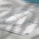 Uma placa RSVP elegante com um efeito brilhante de prata, projetada para complementar a suíte. A estrutura de fundo do papel de arroz, aqua macia e fita lilac, estacas joalhadas, conchas de pérolas e sotaques de gemstone de cristal com sotaque de losango criam uma aparência costeira perfeitamente coordenada. Vamos manter a felicidade desse dia conosco sempre.