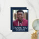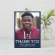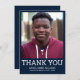 Este cartão de agradecimento de formatura de foto personalizada apresenta uma foto no topo emoldurada em preto com um design de tipografia de texto branco sobre azul com seu nome, escola e ano para personalizar. Adicione uma mensagem de agradecimento no verso do cartão e assinatura ou exclua-a. Criado pela artista Susan Coffey.