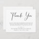 Um cartão de agradecimento de memorial e funeral elegante e clássico com "Obrigado" em uma fonte contemporânea e sua mensagem de agradecimento e o nome do seu ente querido em tipografia simples.