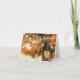 Bilhete de agradecimento de casamento no outono florestal com uma árvore de outono rústica coberta de folhas vermelhas, laranjas e amarelas, um coração esculpido com as palavras "obrigado", e luzes de corda cintilantes.