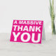 Um obrigado enorme que você saúda cartão com fontes modernas e grandes sobre fundo de cores brilhantes. Está pronto para ser personalizado e é adequado como obrigado que você envia para amigos, família, mãe, pai, professor, enfermeiro, chefe, funcionário, treinador, casamento, chá de panela ou chá de fraldas. Para editar este modelo de design, basta alterar o texto conforme mostrado acima. Clique no botão 'Personalizar' para adicionar mais imagens ou texto, personalizar fontes e cores. Imprima sua família e amigos com o design perfeito!