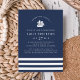 Marque a vela para a maior aventura da sua vida! Nosso doce convite para chás de fraldas náuticos em azul marinho apresenta uma ilustração de nave com "a aventura aguarda" em cartazes modernos, tocando seus detalhes de eventos. Uma banda riscada no marinho e branca na parte inferior completa o design. Cartões invertidos para uma âncora náutica em marinho em branco.