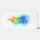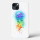 Água-viva grande, iridescente, desenhada artisticamente, brilhante, com longos tentáculos em branco, pintada sobre fundo de aquarela multicolorido. Água-viva arco-íris.