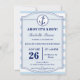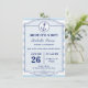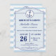O convite para o chá de fraldas deste rapaz apresenta uma âncora e uma corda em um quadro azul claro com uma borda azul marinho fina. O fundo é um padrão de listras azul e branca claro. Está pronto para ser personalizado e é adequado para o chá de fraldas de um rapaz.
