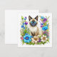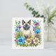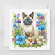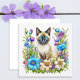Bonito gato siamês com olhos azuis num pedaço de flores azuis e roxas, ai art em estilo aquarela.