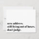 Neste cartão irônico, uma fonte ousada foi usada para renderizar "novo endereço. ainda vivendo de caixas. não julgue." na frente. Detalhes atualizados, juntamente com um amigável "Keep in Touch!" aparecem no verso. Todas as fontes, cores e texto podem ser alterados de acordo com suas próprias necessidades.
