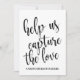 Um elegante sinal de casamento de ponta, apresenta o texto "Ajude-nos a capturar o amor" em uma fonte de letra extrovertida, a textura da pincelada adiciona um sentimento espontâneo e divertido. A cor do fundo pode ser personalizada de acordo com as suas necessidades e preferências, por favor entre em contato comigo se tiver algum pedido especial.