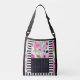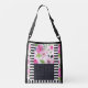 Este belo bolsa aparado em listras brancas e pretas com flores e bolinhas cor-de-rosa é perfeito para qualquer ocasião.