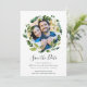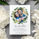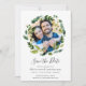 Nosso floral Alabaster salve a data card enquadra sua foto de noivado favorita com uma coroa redonda de cor d'água verde pintada e flores brancas esmagadas. Personalize com seus nomes, data do casamento, local e site de casamento usando os campos fornecidos.