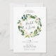 Elegantes convites para casamentos florais apresentam uma coroa de rosas brancas e peônias de cor aquosa com uma luxuosa folhagem botânica verde e folhas, cercando seus nomes em letra chic manuscrita. Personalize com seus detalhes de casamento embaixo.
