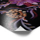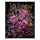 Uma pintura vibrante de flores lilás sobre fundo escuro no estilo tradicional de Petrykivka. A composição apresenta padrões florais complexos, com pinceladas delicadas e varridas que criam senso de movimento e elegância. As flores estão cercadas por folhas de ornamentado e pequenos detalhes decorativos em tons de verde, amarelo e branco, contrastando lindamente com o fundo escuro