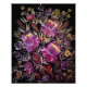 Uma pintura vibrante de flores lilás sobre fundo escuro no estilo tradicional de Petrykivka. A composição apresenta padrões florais complexos, com pinceladas delicadas e varridas que criam senso de movimento e elegância. As flores estão cercadas por folhas de ornamentado e pequenos detalhes decorativos em tons de verde, amarelo e branco, contrastando lindamente com o pano de fundo escuro.