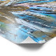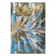 A pintura apresenta flores ouros colocadas sobre um fundo azul abstrato. As flores têm uma casca metálica rica que contrasta lindamente com as várias tonalidades de azul atrás delas. O fundo azul é fluido e texturizado, com gradientes que vão do céu profundo a tons claros, criando um sonho, uma atmosfera etérea. As flores, com suas intrincadas pétalas e detalhes delicados, parecem flutuar ou florescer dentro desse espaço sereno, dando à imagem calor e tranquilidade. A composição global é equilibrada, mas dinâmica, com um sentido de harmonia entre o ouro vibrante e o azul calmante.