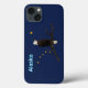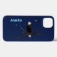 Um Águia Cálida faz uma varredura do céu de sua perca em um galho de árvore; sobreposta a uma bandeira do Alasca. A leitura de texto "Alaska" também aparece em azul e branco brilhantes.