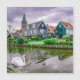 Pintura de casas tradicionais de pesca de madeira, canal e cisne em Marken, Países Baixos. Vista do canal, da ponte e das casas de pesca tradicionais na aldeia das zonas aquáticas. Símbolos tradicionais da Holanda.