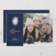 Este cartão de Natal religioso apresenta uma cena ilustrada de natividade, a estrela de Belém, e a caligrafia moderna. A ilustração inclui a estrela brilhante num céu azul escuro, iluminando a cena da natividade abaixo. A palavra "Rejoice" está escrita em um roteiro de caligrafia branca. Personalize o cartão de férias com sua foto favorita e seus nomes.