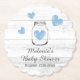 Alegres porta-copos de festa de baby shower de madeira rústica e elegante. Design personalizado com painel de textura de madeira branca e corações desbotados em azul pastel claro. Tipografia de roteiro sofisticado com símbolos de amor e desenho de jarro mason rústico. Estilo country chic moderno para uma reunião divertida. Parte de uma coleção combinando com convites modernos e decorações bonitas.
